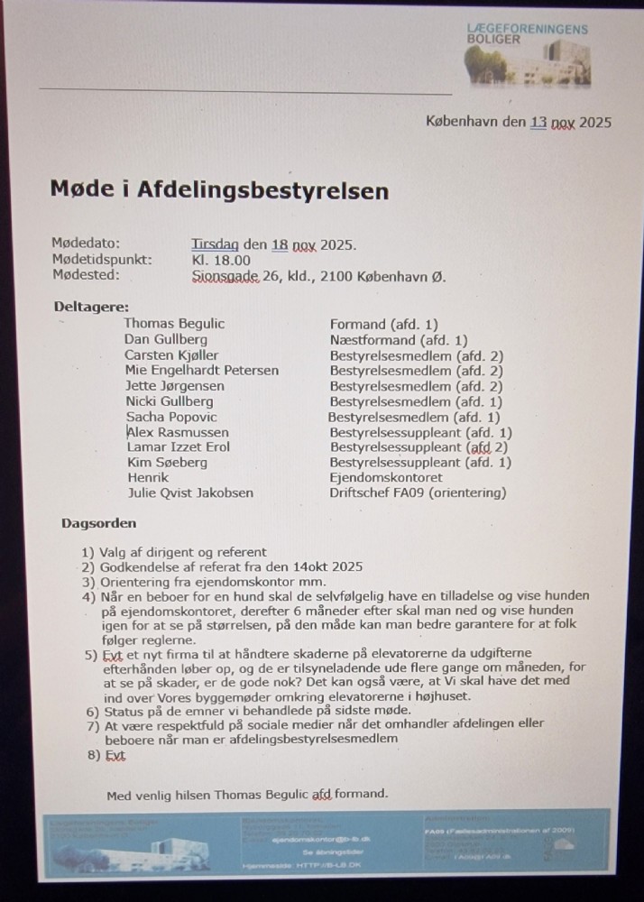 Forslag der ønskes behandlet på afdelingsbestyrelsesmødet skal være formanden skriftlig i hænde senest tirsdag den 4. november 2025.